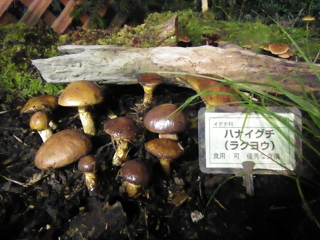 写真中央上は食べるとおいしいハナイグチ。カラマツの林に生えます。