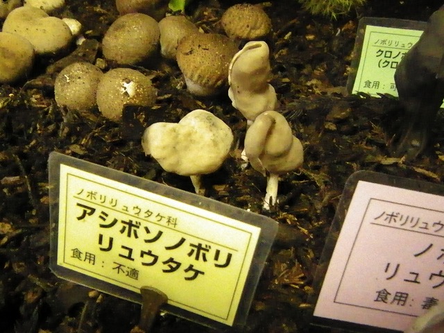 札幌近郊で今の時期に採取できるキノコを名前や食毒の別をつけて展示。