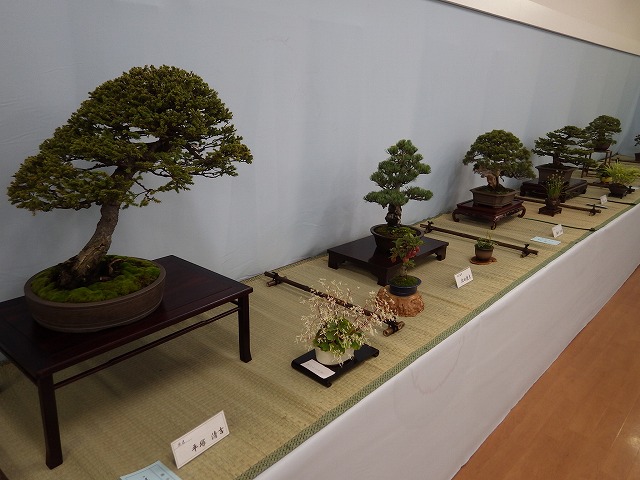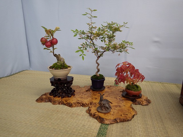 大型の盆栽からマメ盆栽まで197点の鉢と鳥の木彫りや石の飾り8点の計205点を展示。