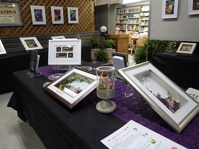 花びらコラージュと呼ばれる額作品とグラス型や円筒形の置くタイプの作品39点を展示。
