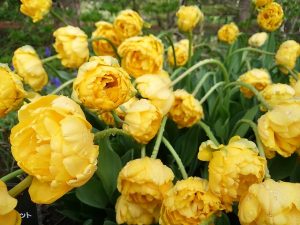 八重咲きのチューリップでも特に花弁が多いタイプで、写真のように雨が降ると頭が重くなり、写真を撮るのに少し苦労します。