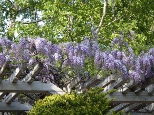毎年なぜかフジ棚の向かって左2/3が始めに咲き、残りは後半に咲きます。