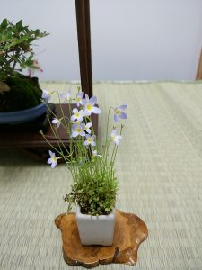 会場には札幌盆栽会会員が栽培した大型盆栽から手のひらサイズのミニ盆栽、春の山野草、草もの、花もの盆栽などバラエティに富んだ約120鉢を展示しています。