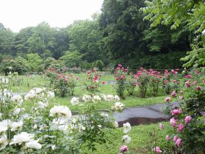 きれいに咲いているバラの横で花壇の植栽をしていた時に雨が。