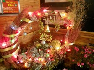 クリスマスのリースやかごがお出迎えしてます。