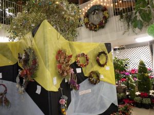 豊平公園花とハーブの会ボランティアさんと一緒に作ったリース作品などが