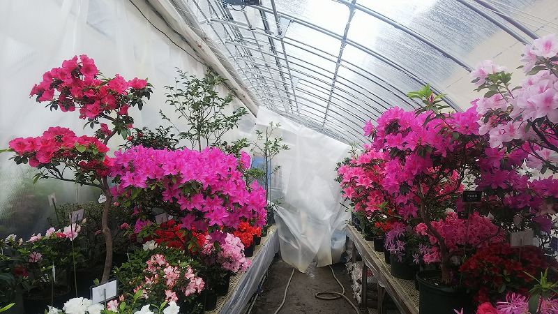 最後は来週から始まるアザレア展に展示予定のアザレアたち。バックヤードのハウスで出番を待つアザレアをちょっとだけお見せしますね。