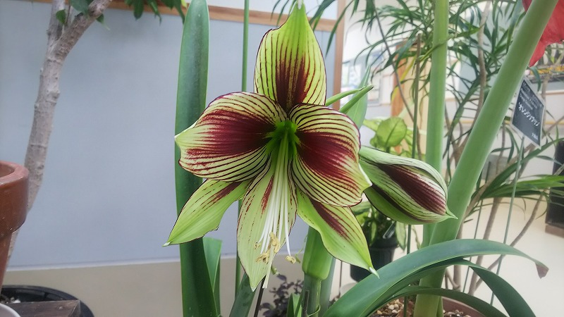 展示している ↑ 他の園芸品種のアマリリスと違い、形も色も独特。やや咲きにくい性質なので、ここ4年ほど花が咲かなかったのですが、今年は見事に咲いてくれました。何本も花茎が上がってきているので、これから続々と咲きます。流行りのインスタ映え、しますかね?