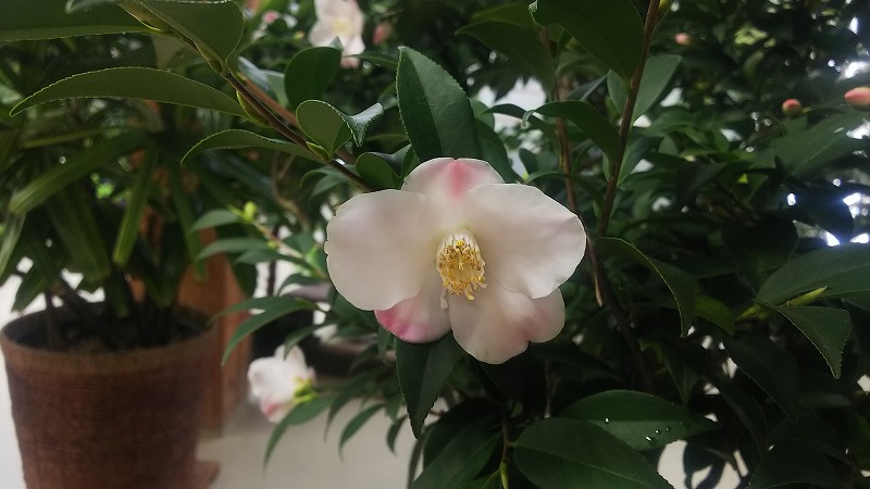 一足早いサクラのように薄いピンク色が愛らしいツバキですね。