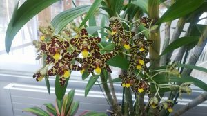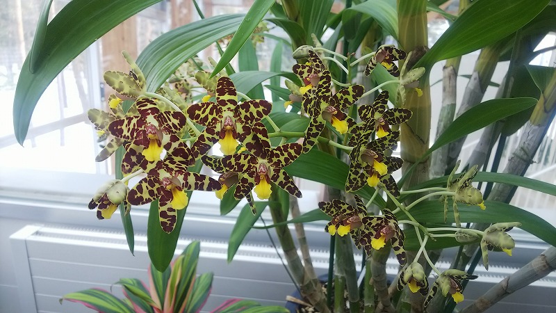 温室の中では「アンセリア アフリカーナ」が満開です。別名レオパードオーキッド(豹蘭)と言われ、豹柄の花が特徴のランです。