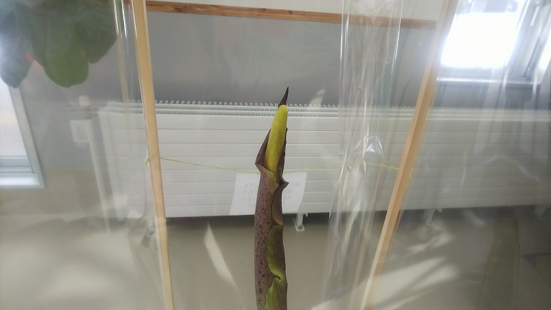 おぉ!頭を出している!来週辺り開花して、異臭を放ちます。興味ある方は是非、見にいらして下さいね。