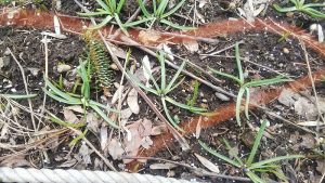 わかりますか?細い葉が四方八方に出ている真ん中に、ムスカリの蕾が見えています。