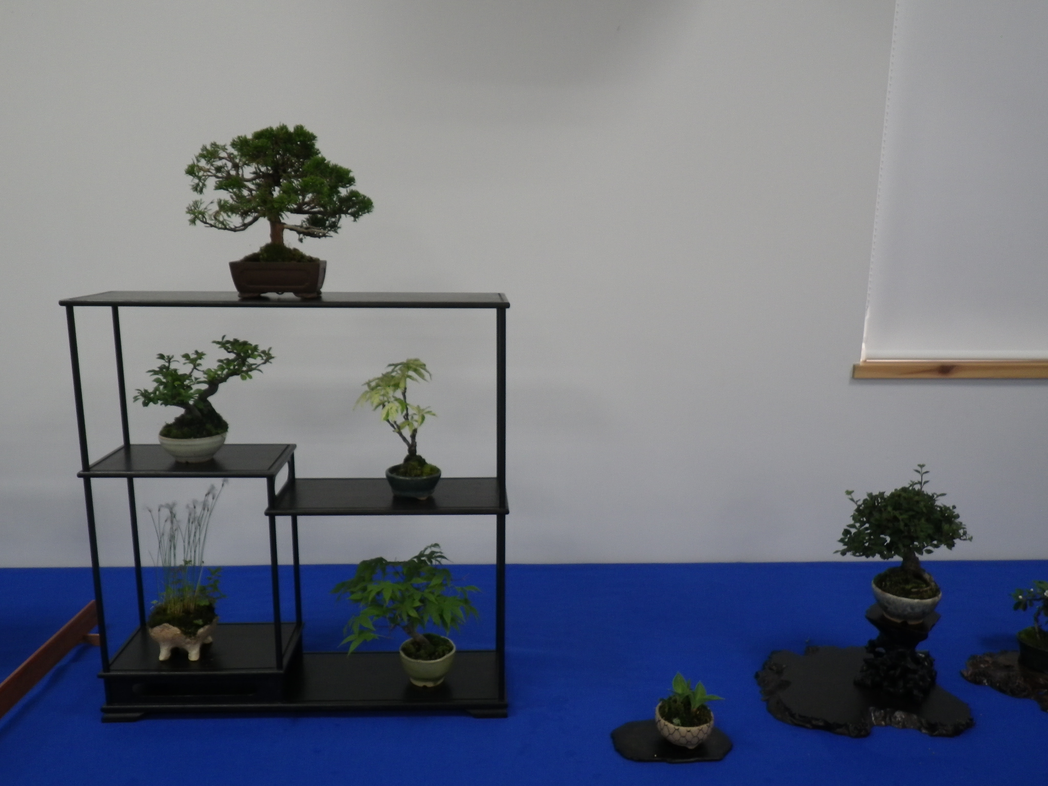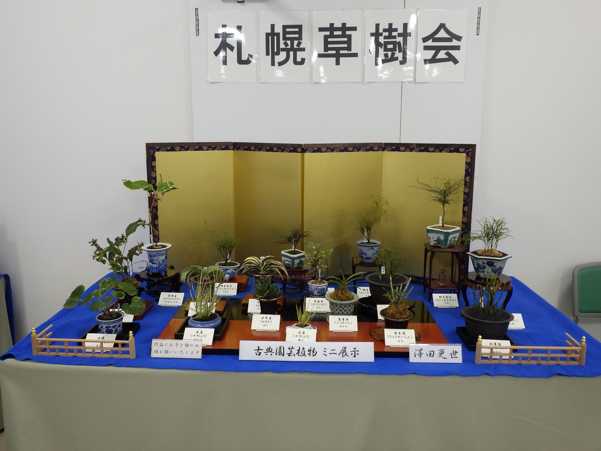 草樹会の会員の人たちが作り上げた席飾り16点、平飾り9点、ミニ展示18鉢、総数はミニ展示と合わせて226鉢展示してます。札幌草樹会の会員の人に話しを聞きましたところ、この展示会に向けて作る目標を決め、花ものを手入れするのが一番苦労したみたいです。小さいので0.5号鉢(1.5センチ)から大きいもので3号鉢(9センチ)のミニ盆栽が展示してあります。