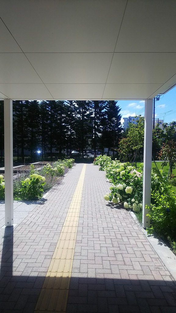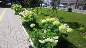 センター横の花壇沿いにはアナベルが両側に咲き、ベンチに座るとアナベルに囲まれます。日当たりも良好なので、お散歩の休憩にはもってこいの場所ですね。昼には満席になる人気のベンチです。