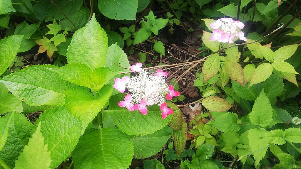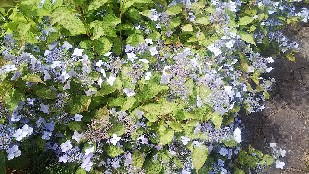 ヤマアジサイ系の繊細なガクアジサイが咲いています。よくよく見ると葉に白い斑が入っています。