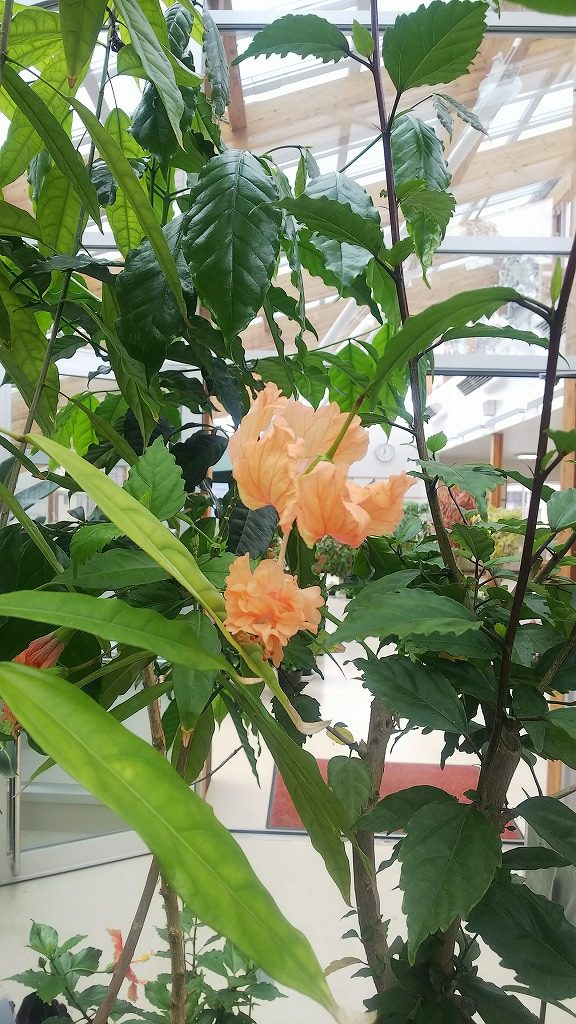 まるで風鈴のように垂れ下がって咲くさまが可愛らしい。この時期になると2階ホールや温室では色とりどりのハイビスカスが咲き誇ります。
