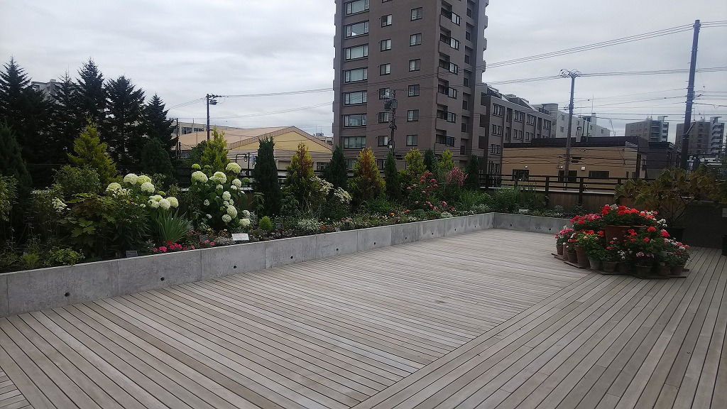 2階ルーフガーデンは夏花壇への切り替えが終わり、これから華やかになります。それまで少々、お待ちください。
