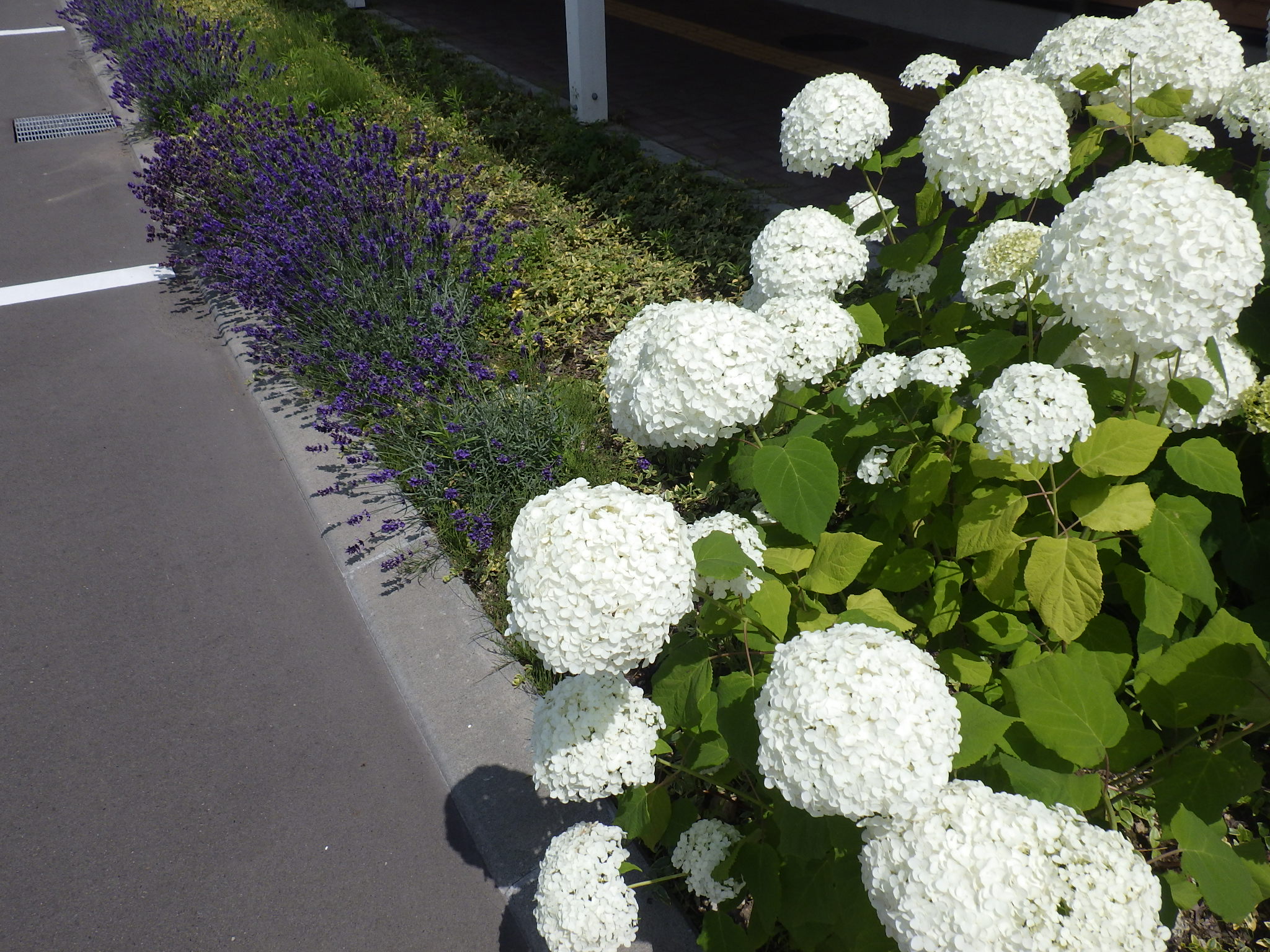 手前の白い花がアナベル、奥の方に見える濃い紫はラベンダーです。