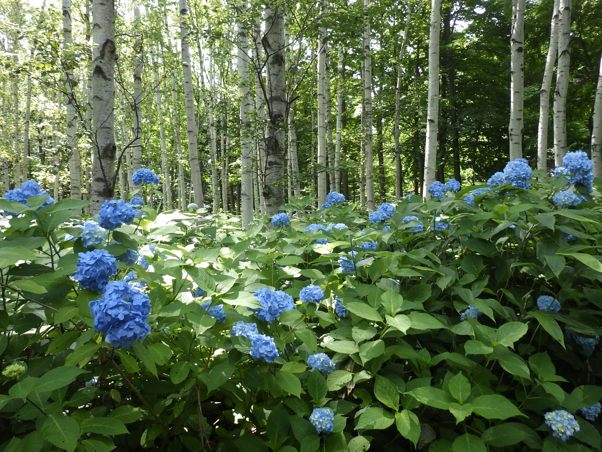 先日からこのHPでご紹介していたアジサイとシラカバのエリア、昨日の晴れ間に見に行ったら、あまりに綺麗だったのでご紹介しますね。