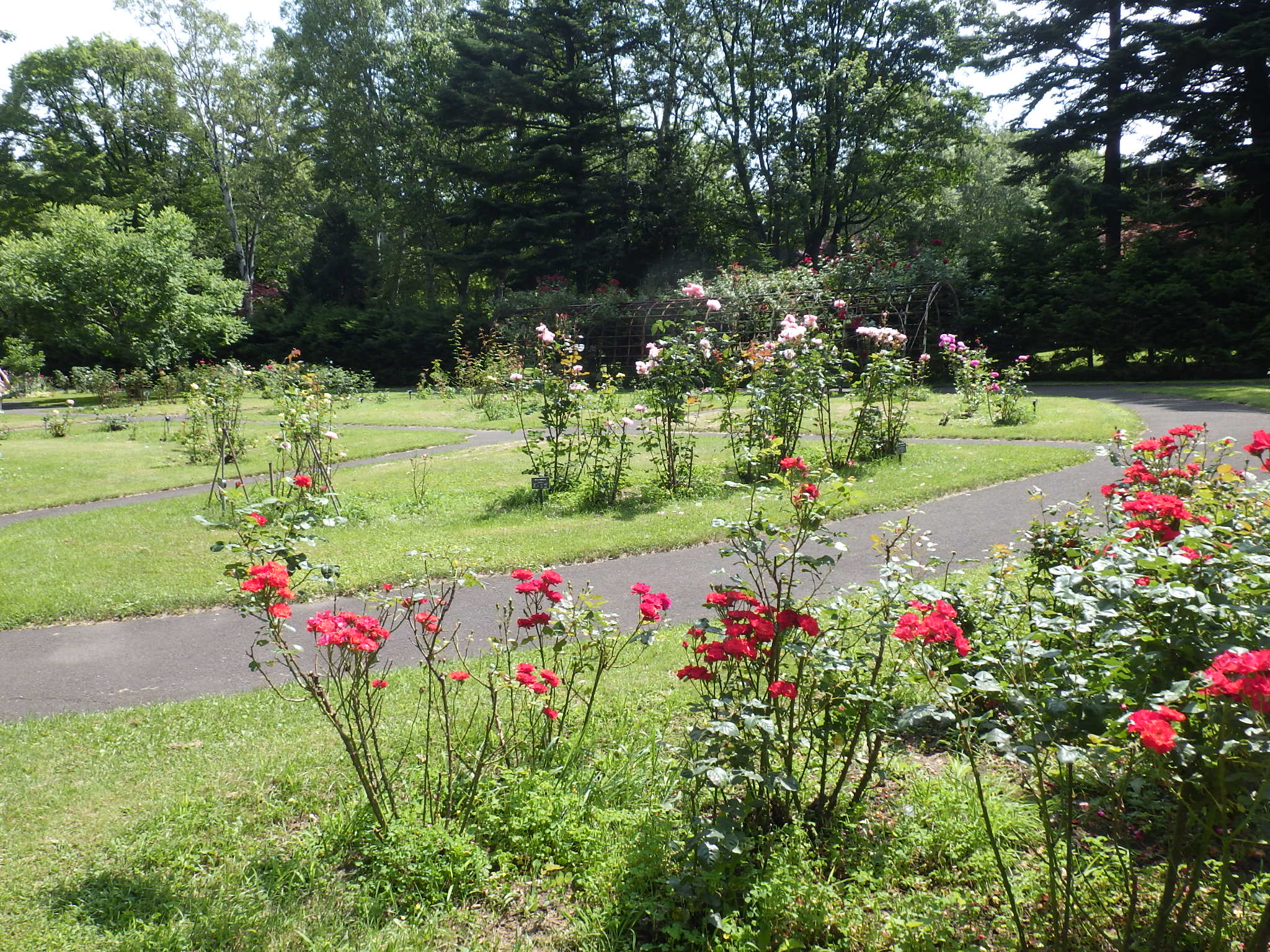 花木園のバラは赤、ピンク、黄色、白といった色合いだけではなく、剣弁咲きや一重咲き、つるバラなどもあり、結構種類があります。