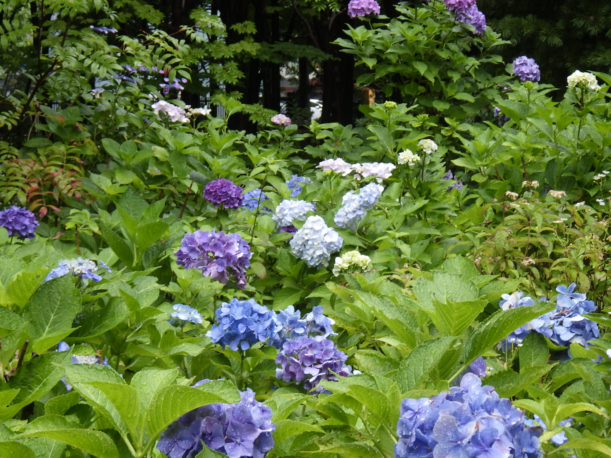 アジサイで今綺麗なのは池の近くにある四阿横の様々な品種が植えられているエリアです。タマアジサイやガクアジサイ、ヤマアジサイがあり、さらに一重や八重咲き、色も白・ピンク、青、紫などがあります。見てみてくださいね。