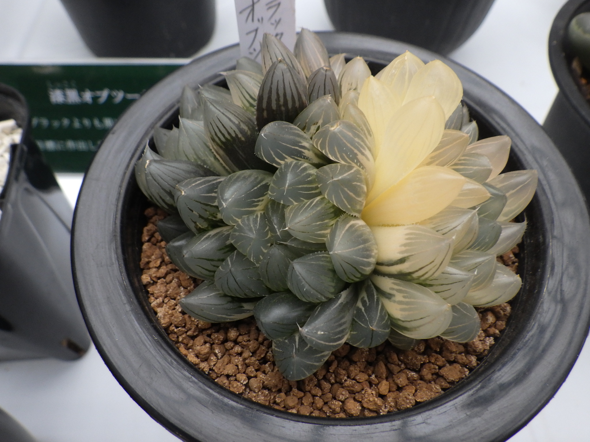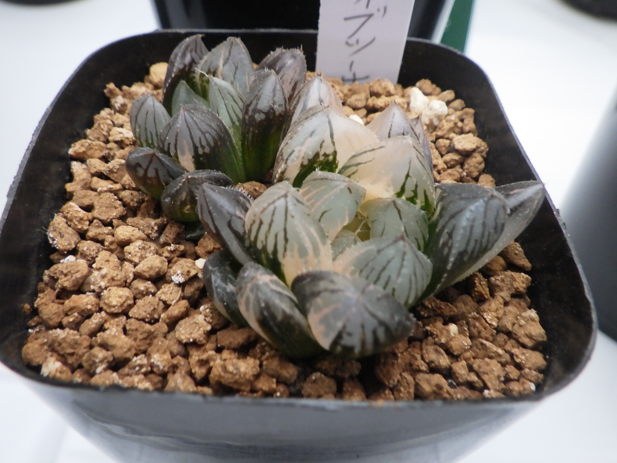 白やグレーの葉色に真っ黒な筋が入っています。これは会員の方が実生から育て、他にはないオリジナルだそうです。命名も会員です。