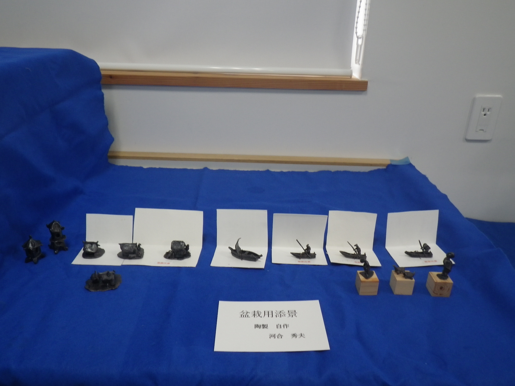 最後に紹介するのは盆栽用添景で、盆景作品に欠かせない置物です。前会長の手作りで、1つ1つ見ていくと亀や船、小屋などきめ細かく作られています。鉢もそうですが、他の会員さんが飾っているミニ盆栽の鉢も前会長が焼いた鉢だそうです。手作りなので、1つとして同じものはなく、そこにも注目して見ていただくとより一層楽しんでいただけると思います。