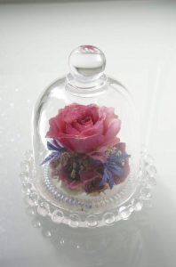 「レカンフラワー」とは、自然の花や葉を立体状態で乾燥させたものを使用し、草花をそのままの形で立体的な額やドームに入れて保存できるのが特徴です。多様なアレンジが可能で変色防止のために密閉するので、花の色をそのまま長く楽しむことができる新しいフラワークラフトです。