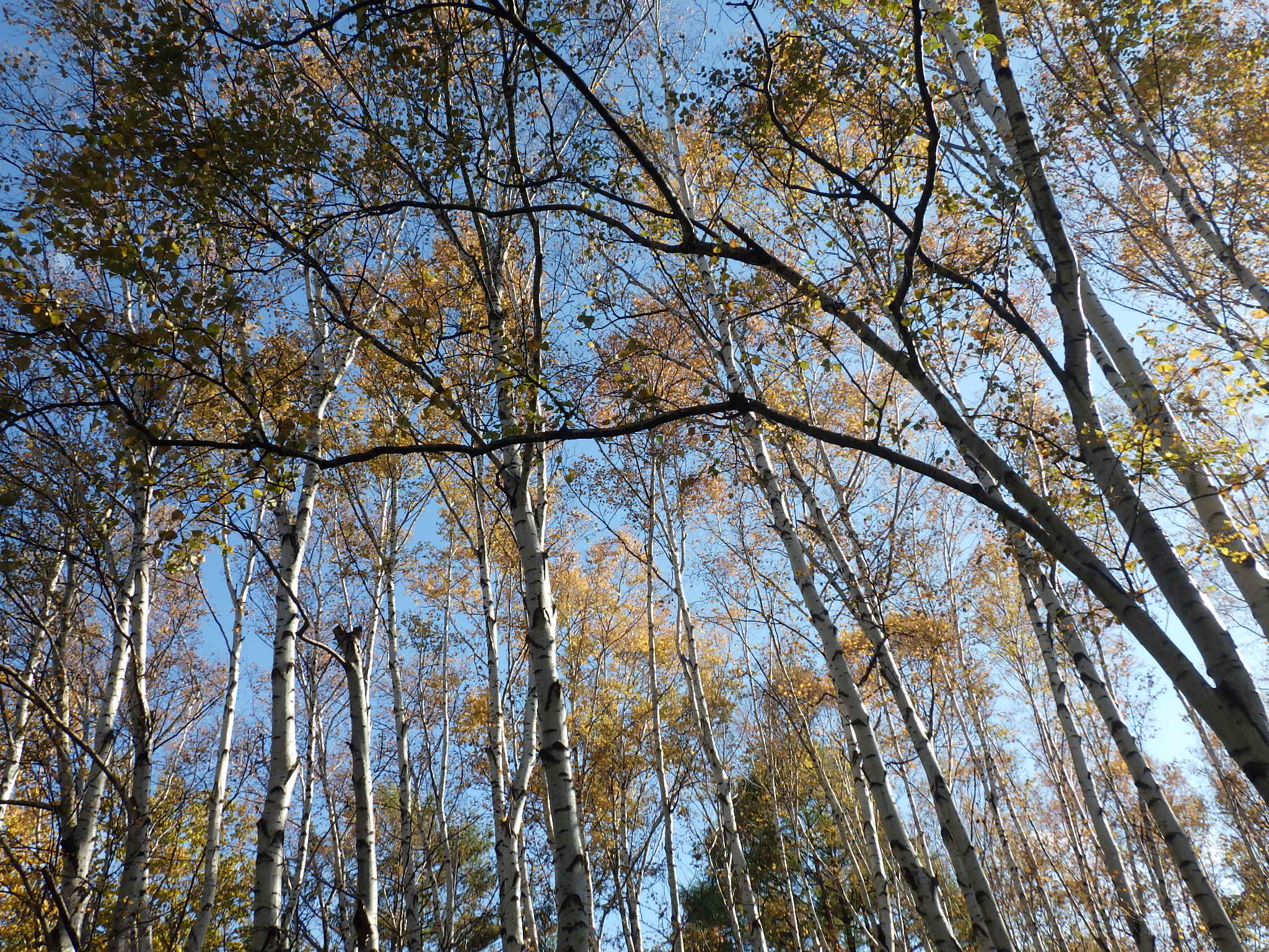 もう少し空が青くて、私の腕が良ければ、少なくなった葉の黄色と樹皮の白と空の青さが秋の進みを伝えてくれる風景だと思うのですが、残念。