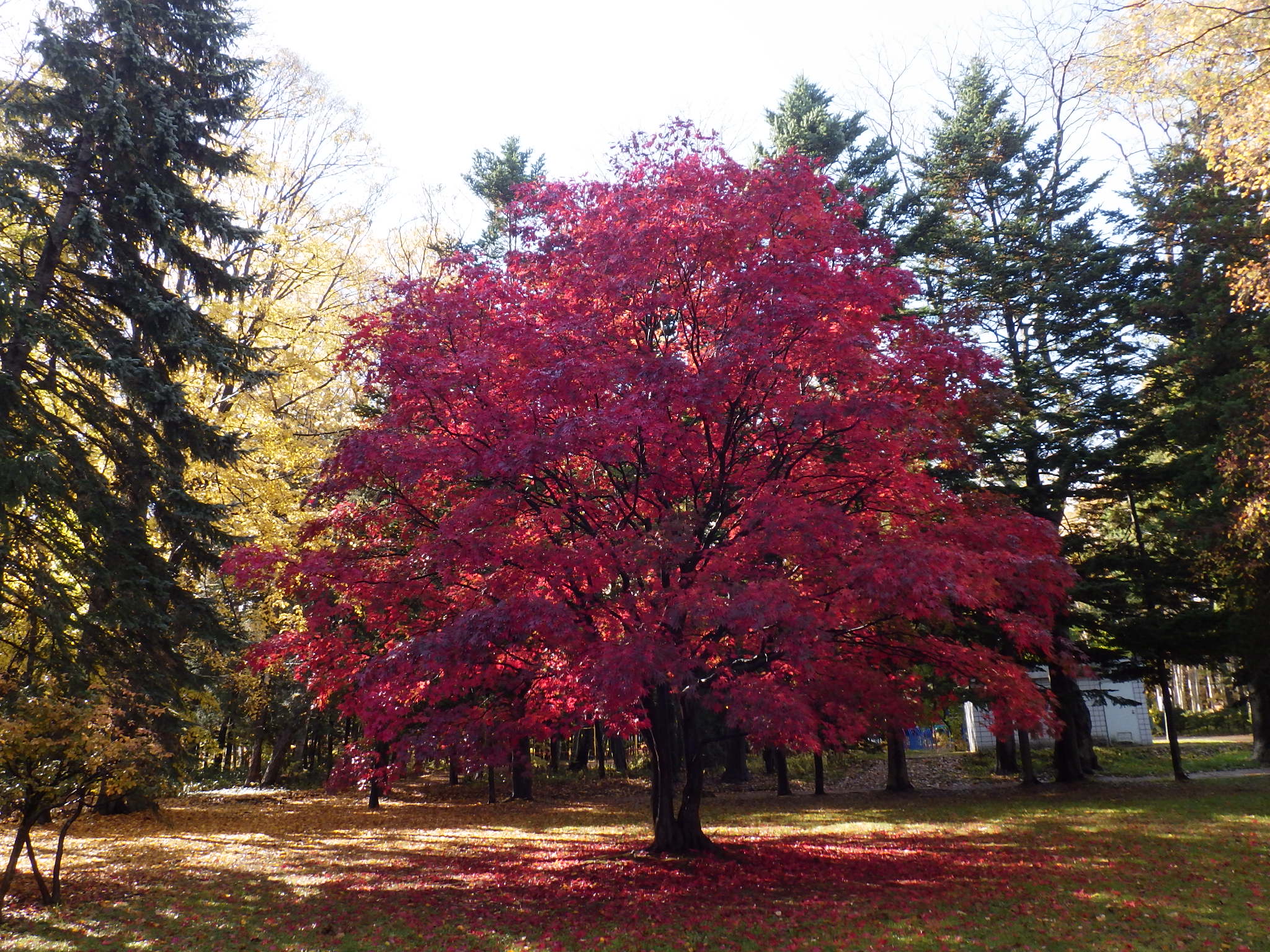 実はよく見るとまだ葉の黒っぽい部分も見えるのですが、木も赤く、その下の地面も赤い葉に覆われています。見応え有りますよねぇ。