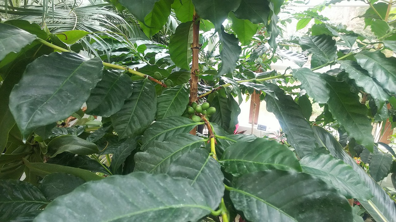 コーヒーノキに緑のコーヒー豆がなる様子
