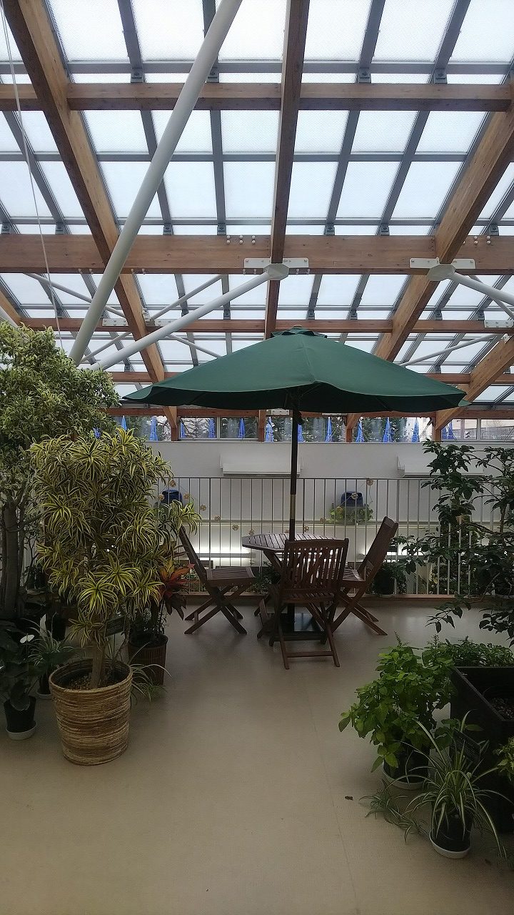 植物に囲まれた空間です。本を読んだり暖かいドリンクを飲んだり。下を覗くとクリスマス色。寛げます。