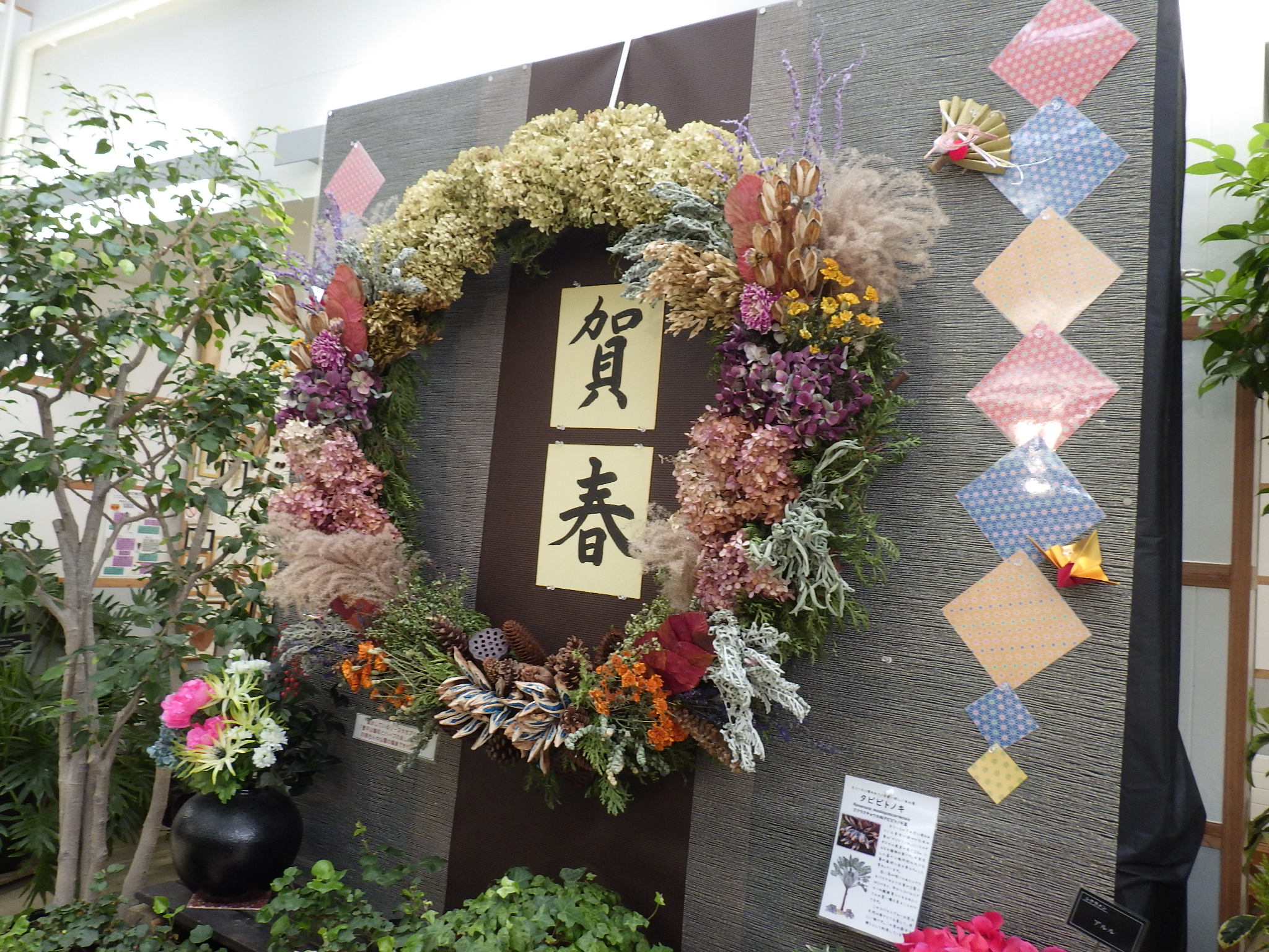 クリスマス展で使った大リースもお正月仕様にチェンジ。