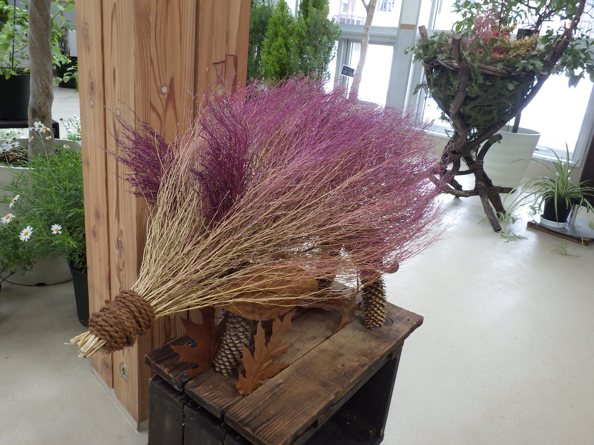 赤く紅葉したコキア(ホウキギ、ホウキグザ)をドライフラワーにした物で作られています。