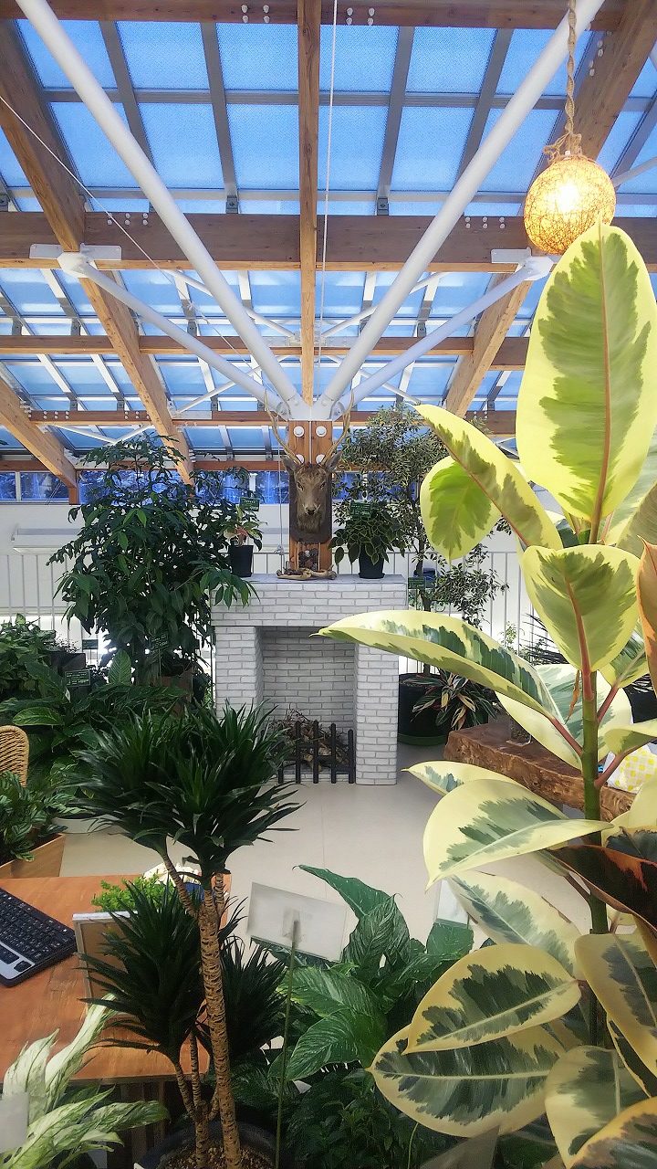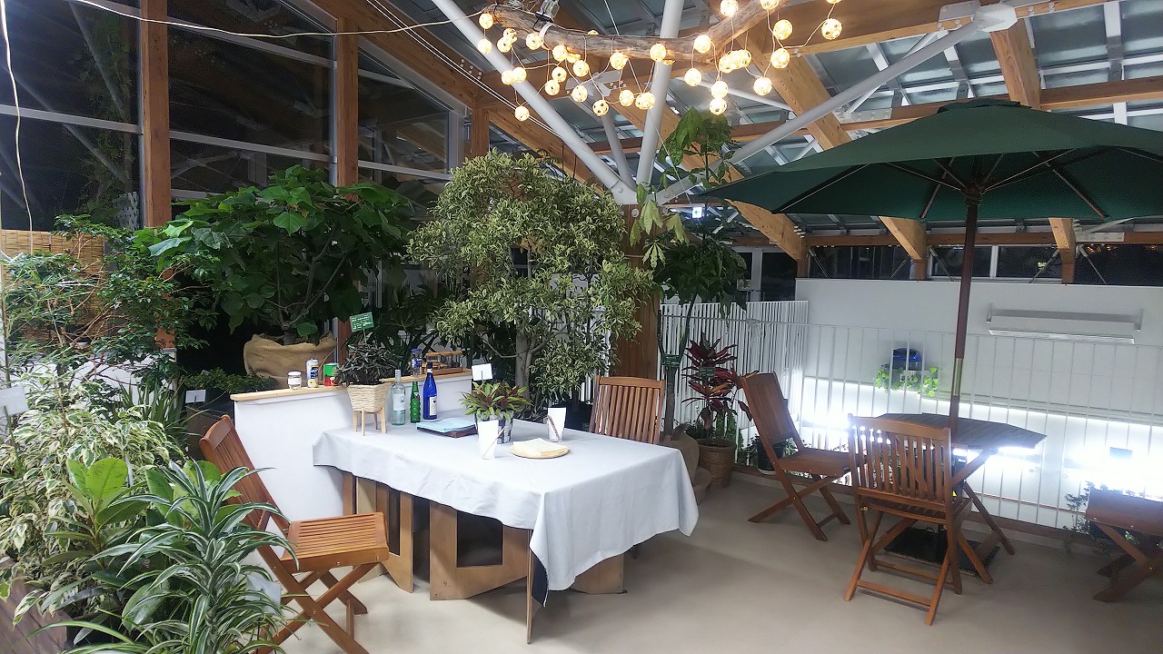 ちょっと南国風にバナナの葉の下にソファーを置き、座ると植物に囲まれてまったり。なかなか立ち上がれないですよ。