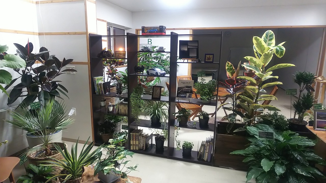 リビングやキッチンなど、お部屋を再現した展示スペースに、それぞれの植物に適した置き場所や育て方のポイントなどを添えて展示しています。