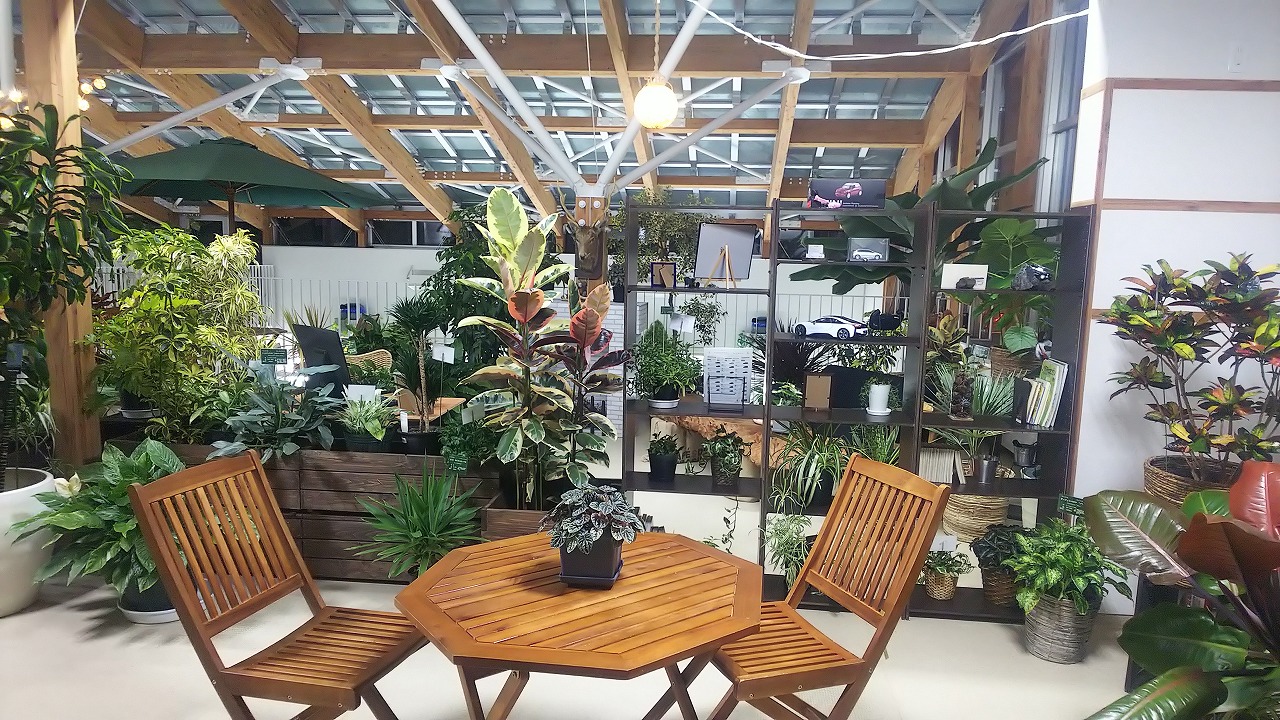 植物に囲まれてゆっくりと過ごせるよう、飾り棚を挟んで向こう側には休憩スペースをご用意しています。