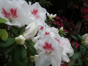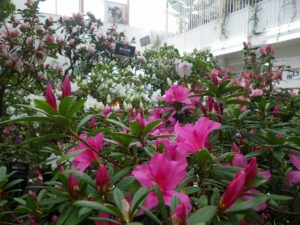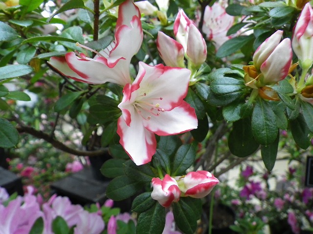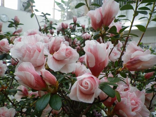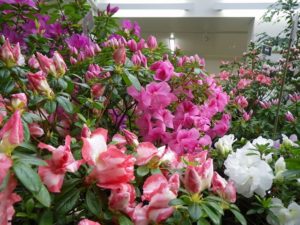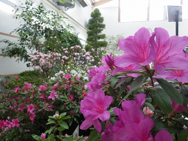 色とりどりのアザレアの他、ヒラドツツジや30年近く育てた1.5mほどのアザレアの大株など、
