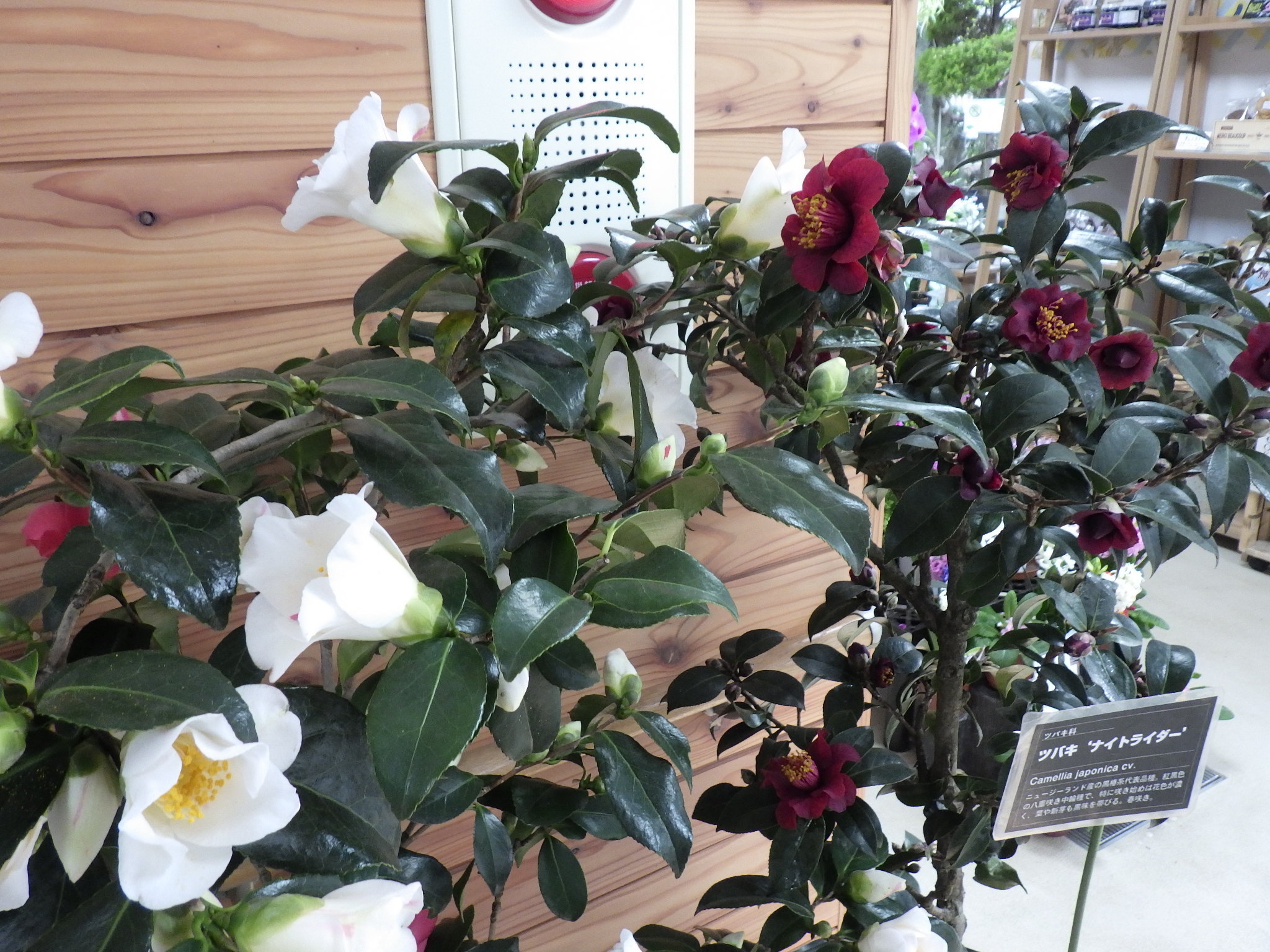 上の写真は白いツバキと黒っぽい赤色がシックな’ナイトライダー’というツバキが並んでいます。