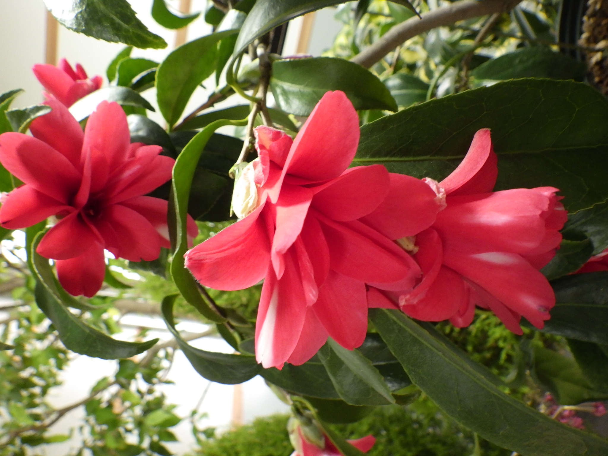 上の写真の花弁が細長く薄めの赤色のツバキは’孔雀椿’。