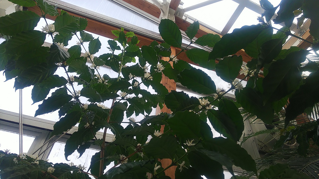 コーヒーノキです。普段皆さんが飲むコーヒーはこんな繊細な花が咲き、ジャスミンに似た甘い香りがします。