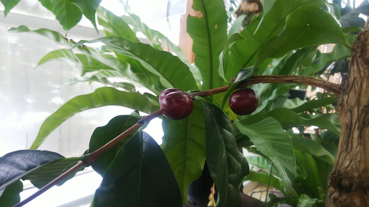 じゃ、豆はどこにあるの?それは白い花が咲いた後、花の根元にある子房が膨らんでコーヒーの実になります。緑色から写真のような赤色に変わって熟します。