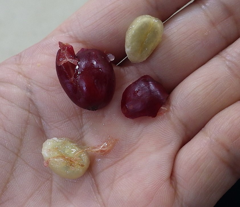 この赤い実の中にタネがだいたい2粒入っていて、それがコーヒー生豆になります。
