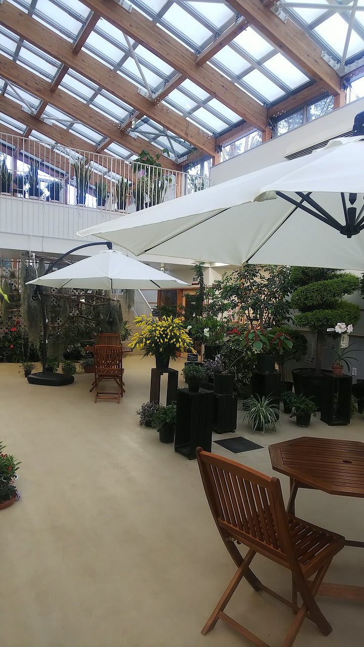 2階ホールには以前からパラソルが開いていました。晴天で陽が射す時はその下で本を読んだり、コーヒーを飲んだりとそれぞれの時間を過ごしているお客様がいらっしゃいましたが、本を読むにはグリーンのパラソル下は暗いかなと思い、1階には白いパラソルを設置しました。お花に囲まれた明るい空間で、ゆったりとしたひとときを過ごしませんか?