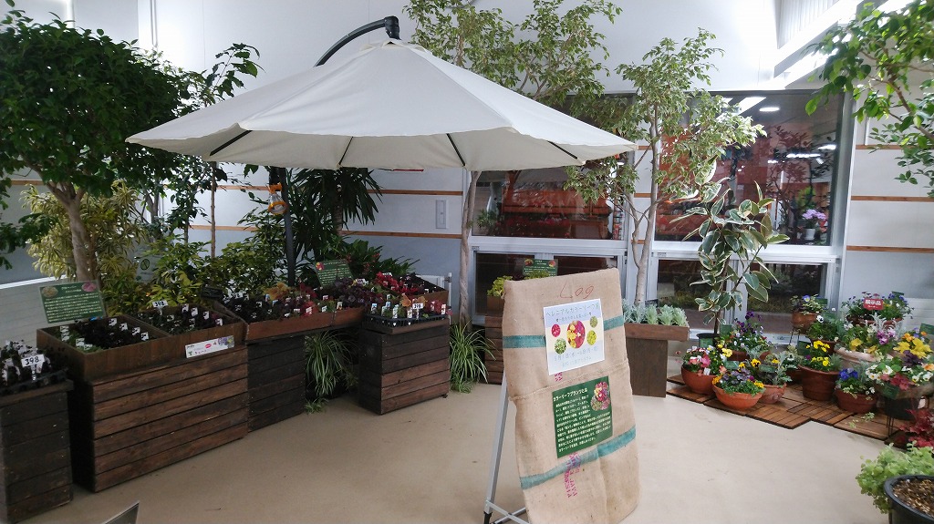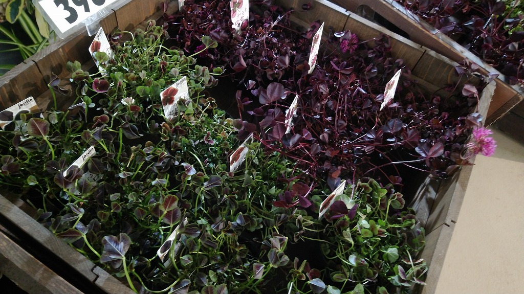 販売ブースはマルシェ風になっています。たくさんの種類からお好みのものを、お選びください。価格は150円から498円です。ヒューケラとクローバーはポットの大きさで値段が違いますので、お間違えの無いようご注意ください。