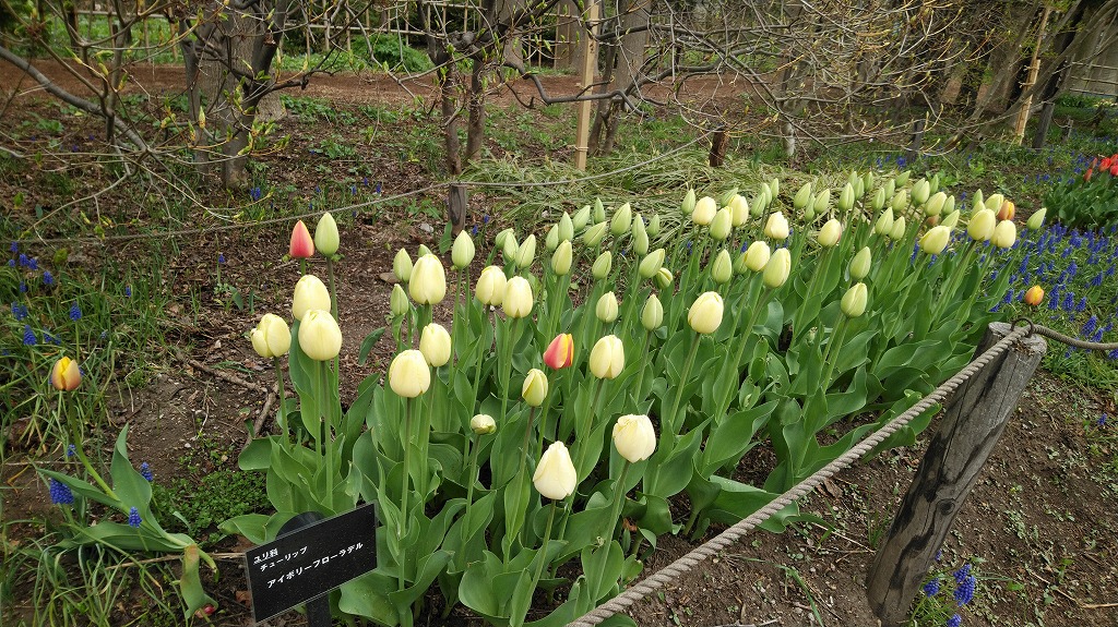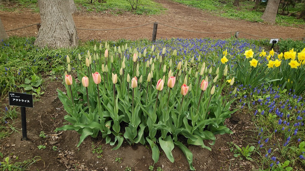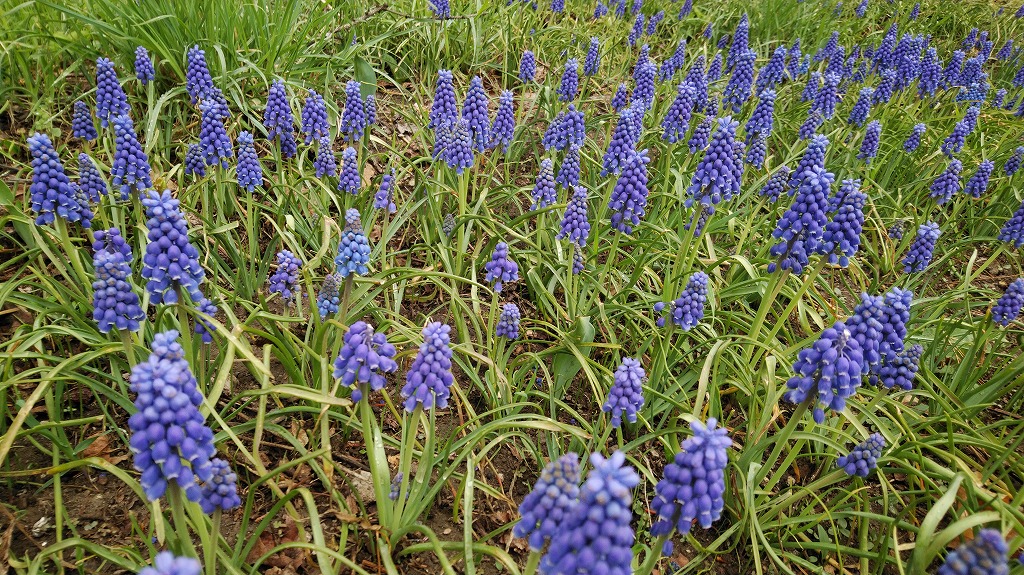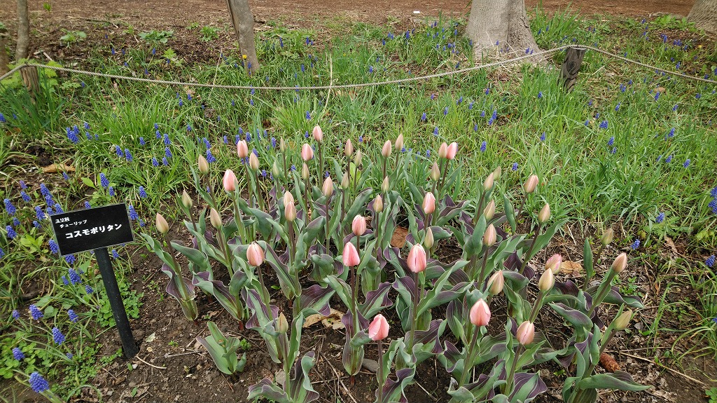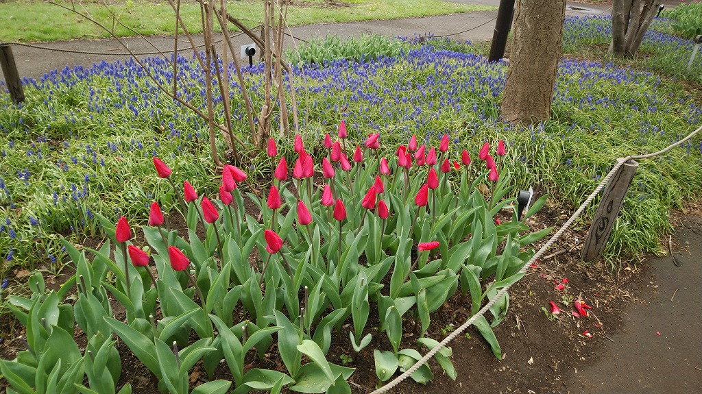 ムスカリの青いカーペットが出来つつあります。チューリップは一部の早咲き種が咲いてきています。