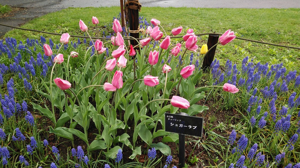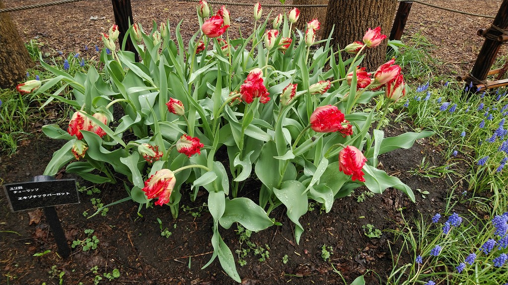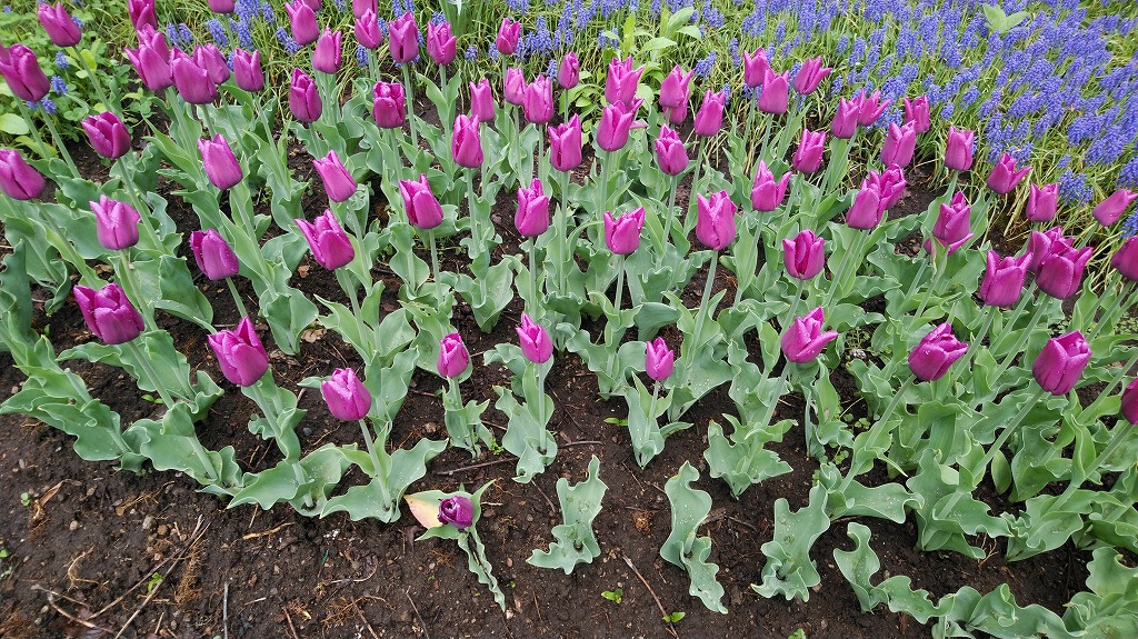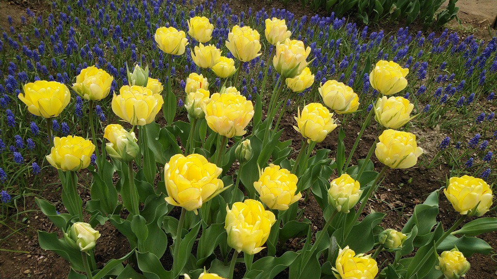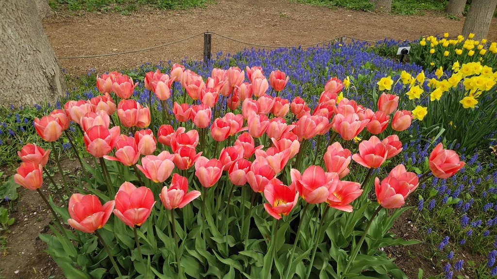 ムスカリの青いカーペットに色とりどりのチューリップが咲いています。