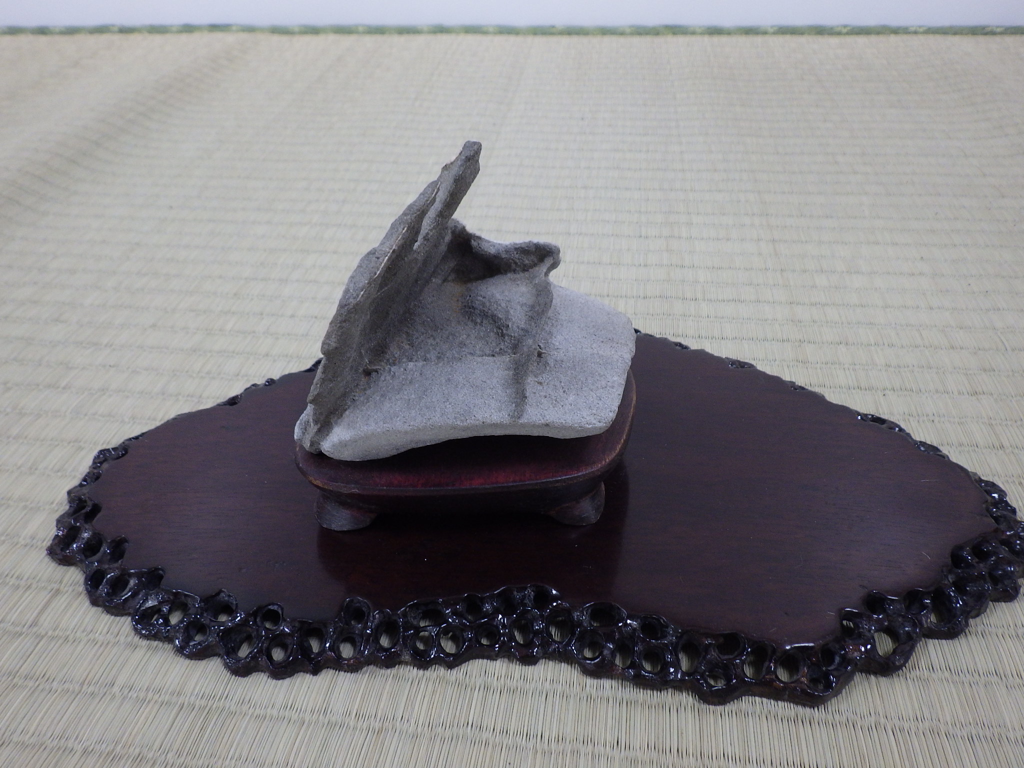 盆栽の飾りでは色や形が美しい石が添えられていますが、この石はどちらかというと、面白い、です。
