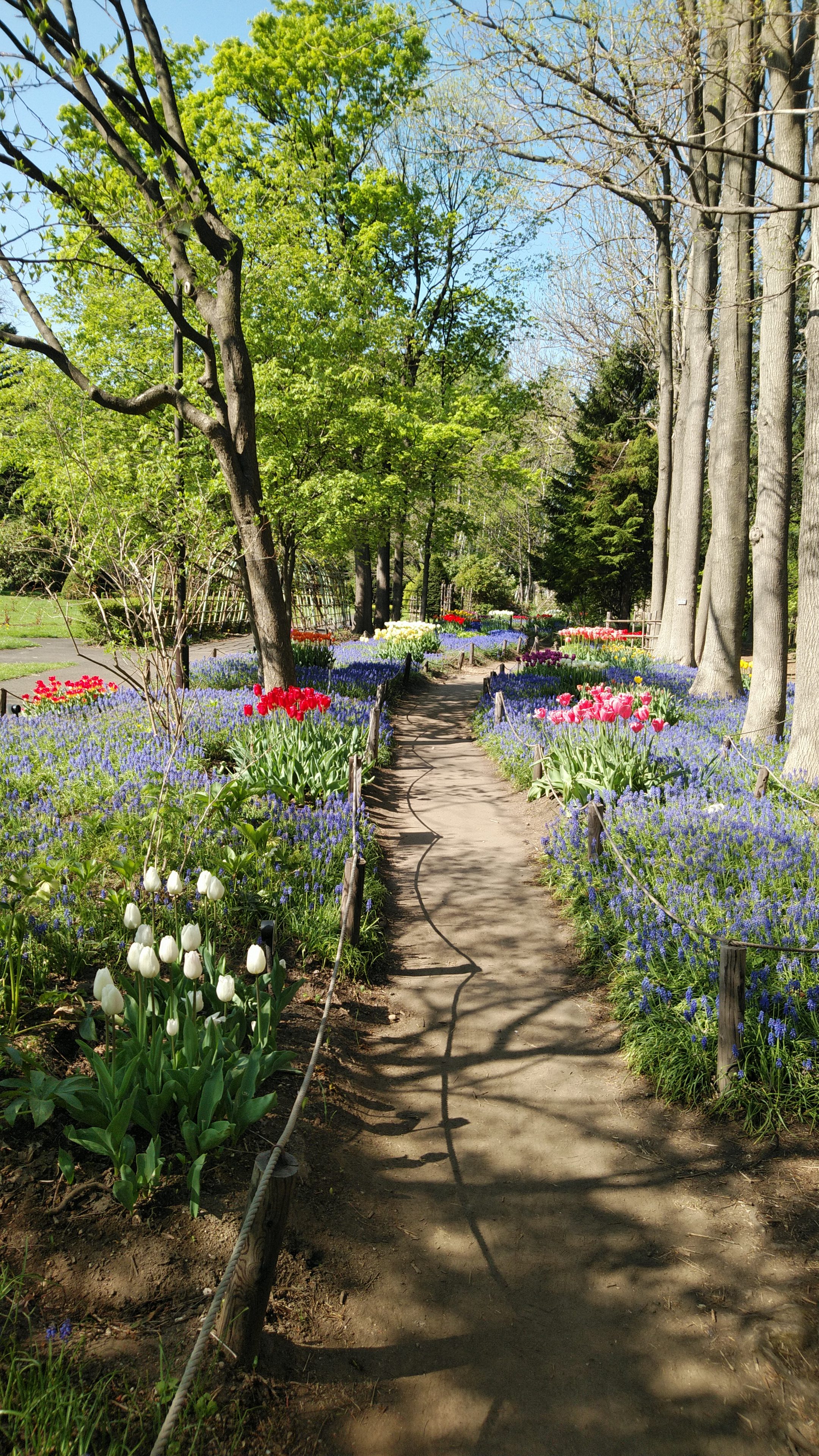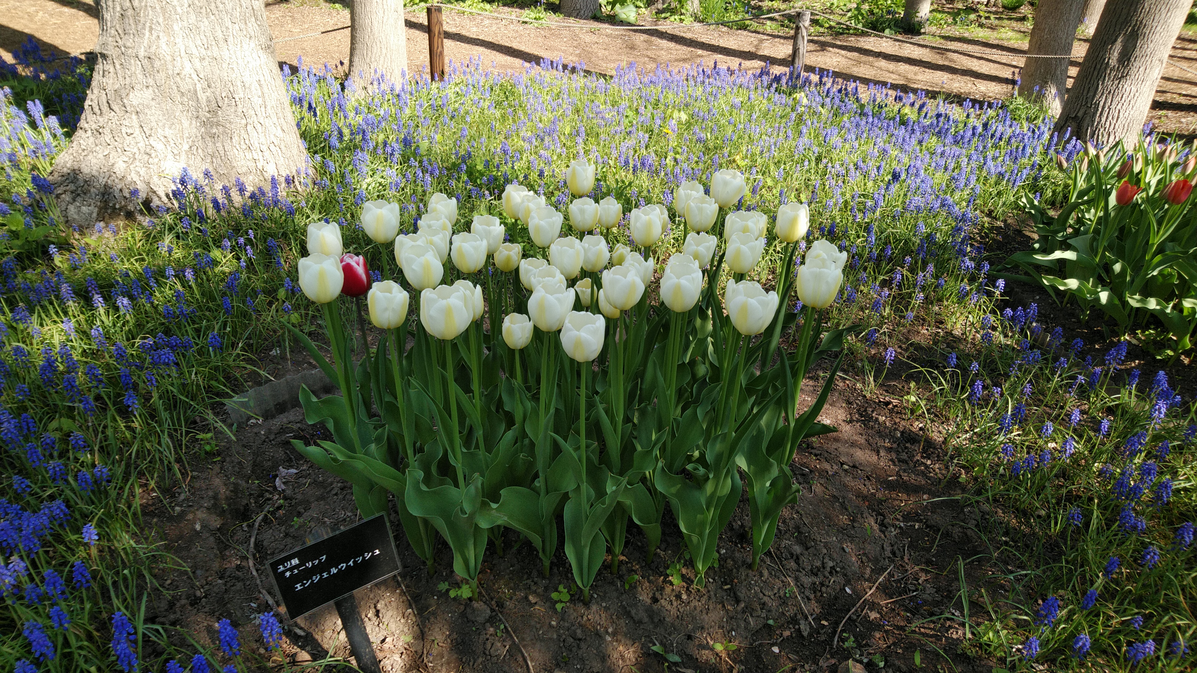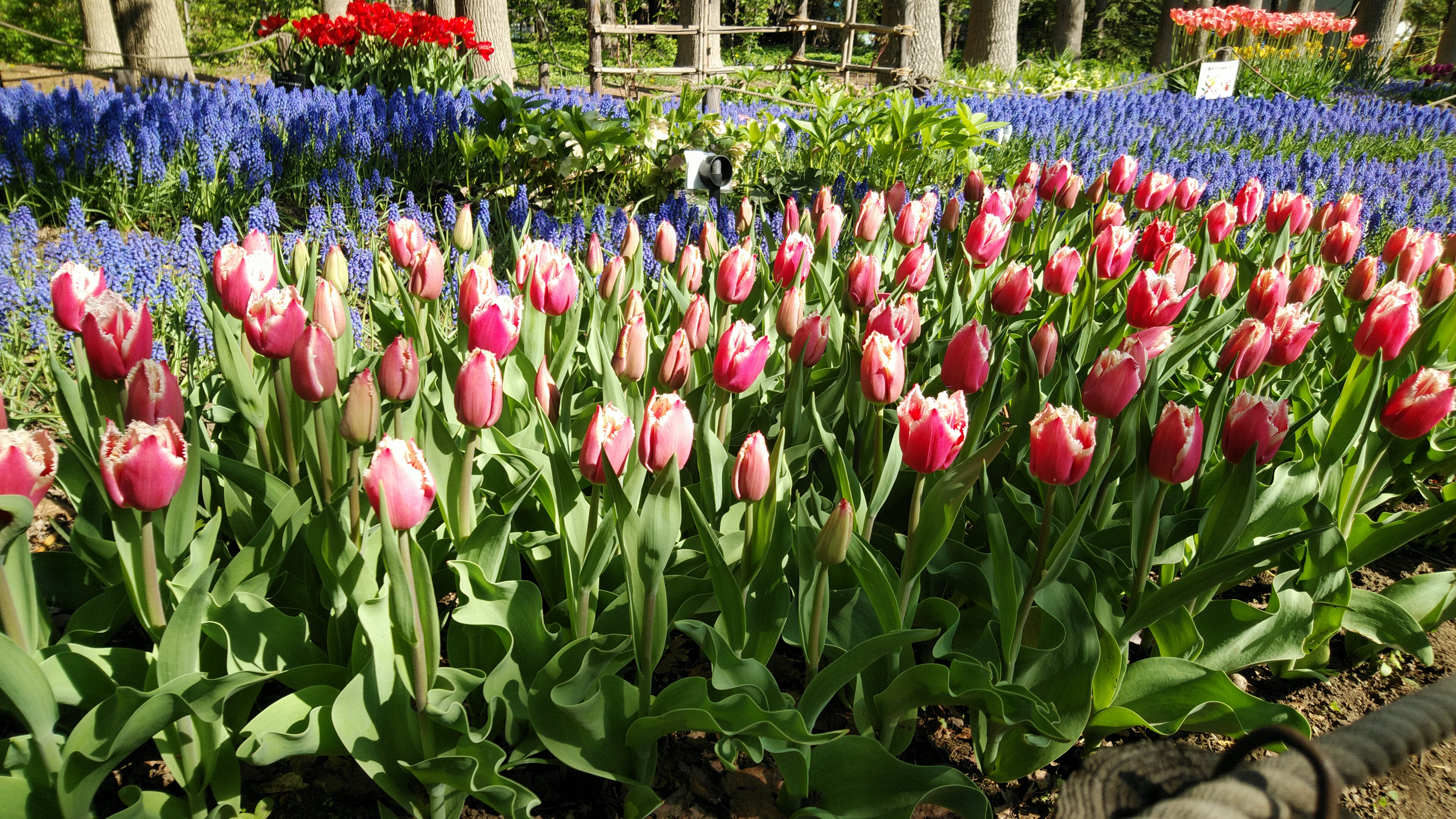 薄紫のムスカリの中にいろんな色のチューリップのブロックが見える