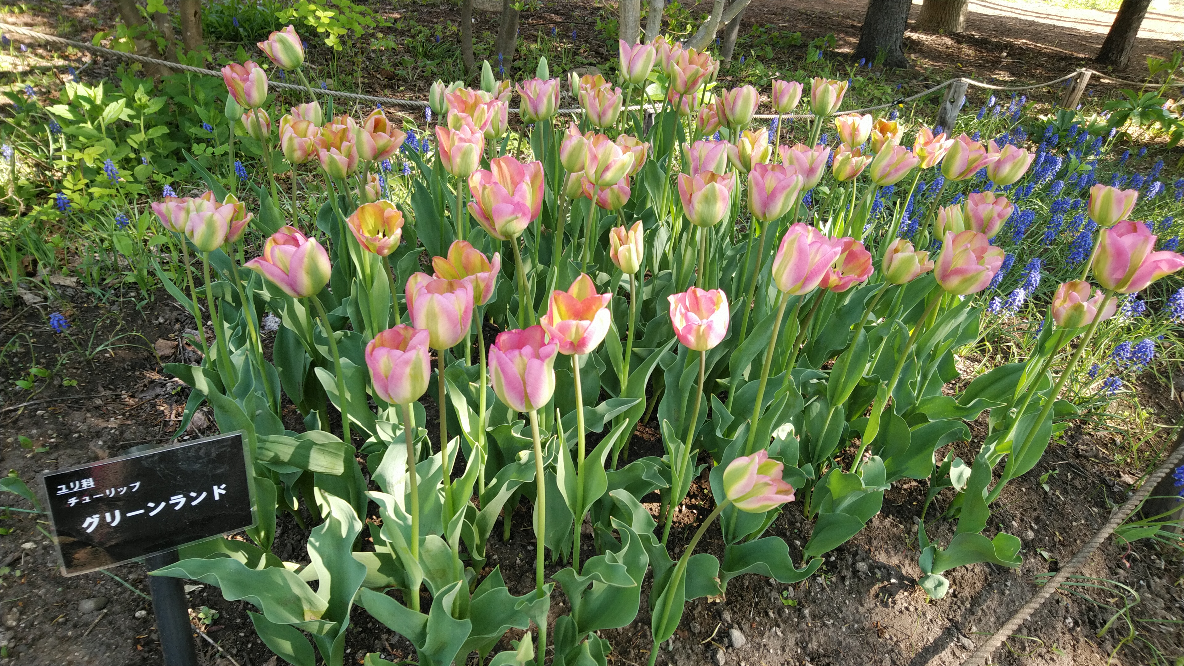 上の写真はチューリップ’グリーンランド’。薄めのピンクの花弁の中央縦にグリーンが入るチューリップ。